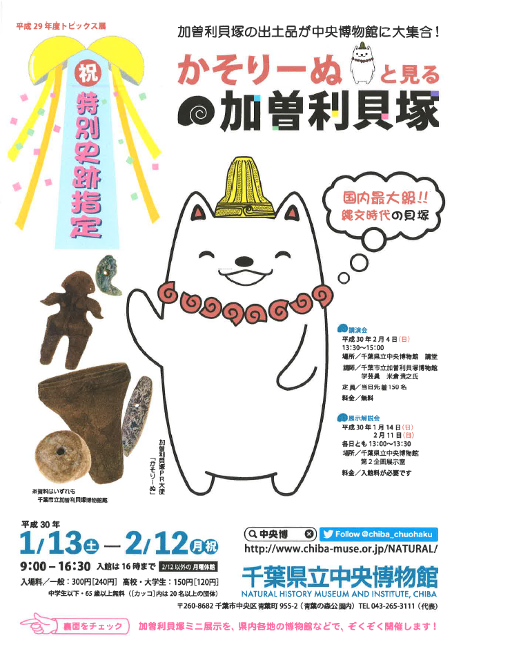 平成29年10月、千葉市に所在する加曽利貝塚が国の特別史跡に指定されました。加曽利貝塚は、縄文時代の大規模貝塚としてよく知られていますが、我が国の文化を象徴するものとして、このたび「国宝級」の特別史跡に指定されたものです。千葉県立中央博物館では、トピックス展で、「千葉県まるごと加曽利貝塚イヤー」を盛り上げていきます!