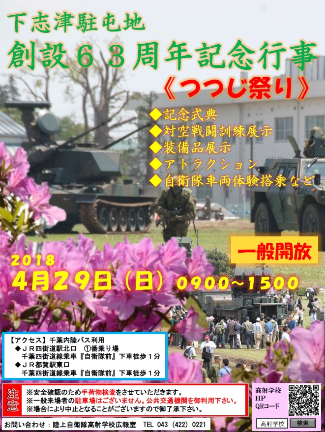 今年も陸上自衛隊下志津駐屯地にて「つつじ祭り」が開催されます。
