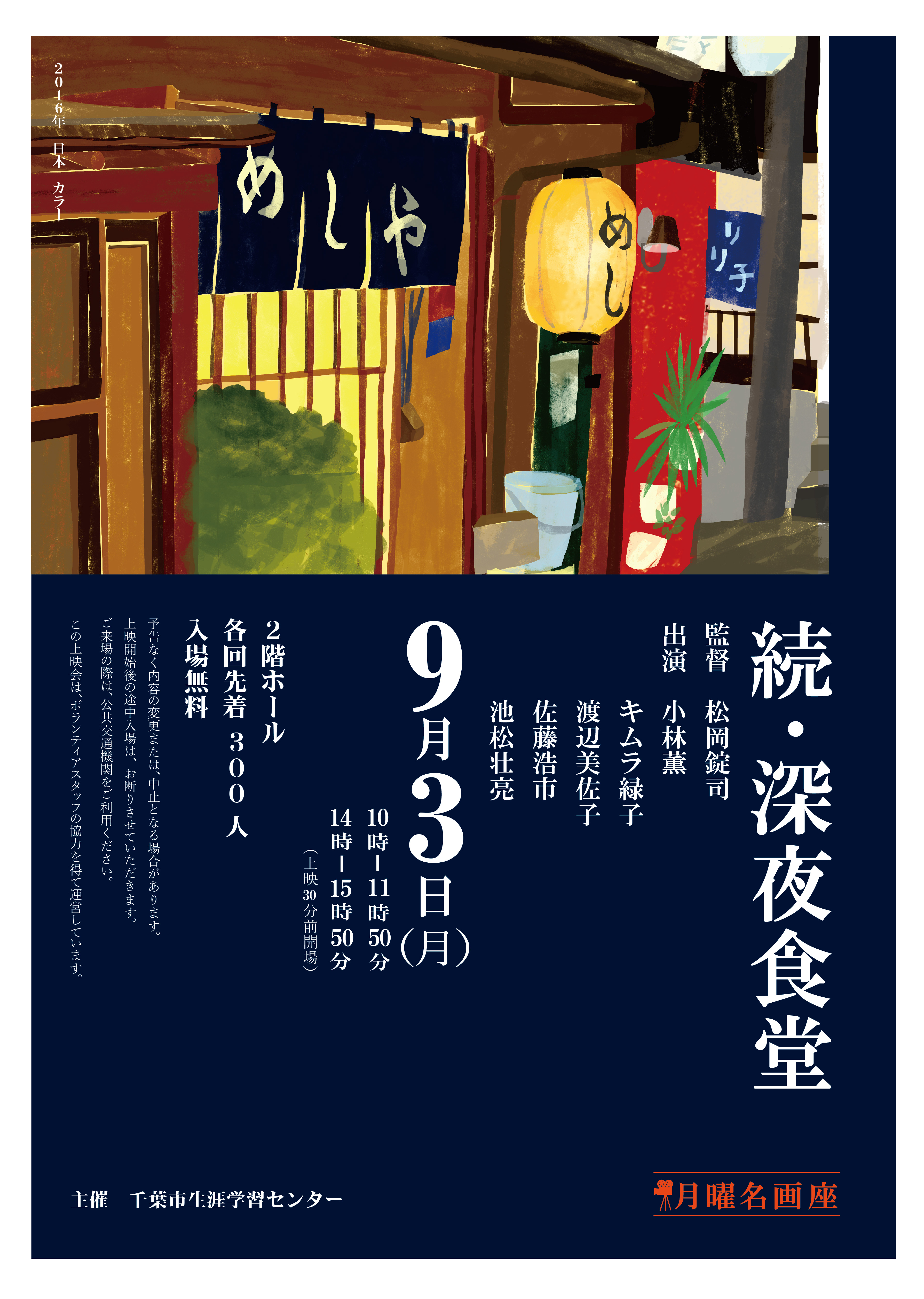 | 開催日 | 平成30年9月3日(月) 【1回目】10:00~11:50【2回目】14:00~15:50 上映30分前から受付開始 |