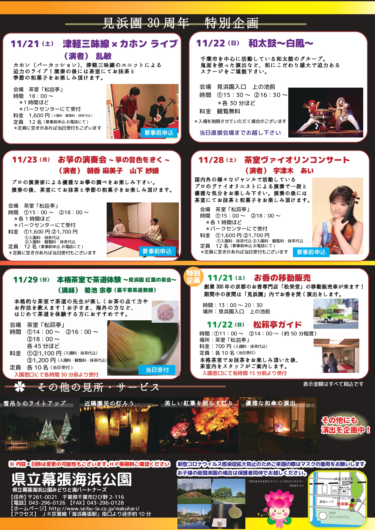 1990年の開園から30周年の日本庭園「見浜園」では幻想的なライトアップイベントを開催。園内の紅葉はもちろん、近隣園児手作りの飾りなど、見どころ多数! 期間中は開園時間・呈茶営業時間を延長。期間中の土日祝日に音楽演奏会などのイベントや香りの演出も予定。紅葉とライトアップが織りなす幻想的な風景を楽しみませんか?